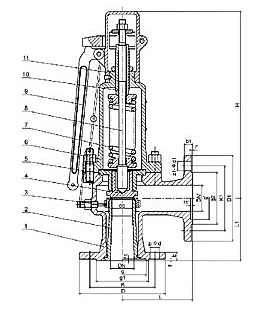 | A47H型帶扳手彈簧微啟式安全閥適用于工作溫度≤350℃的蒸汽、空氣等介質的設備或管路上。作為超壓保護裝置。連接法蘭標準按JB/T-94的系列 | |